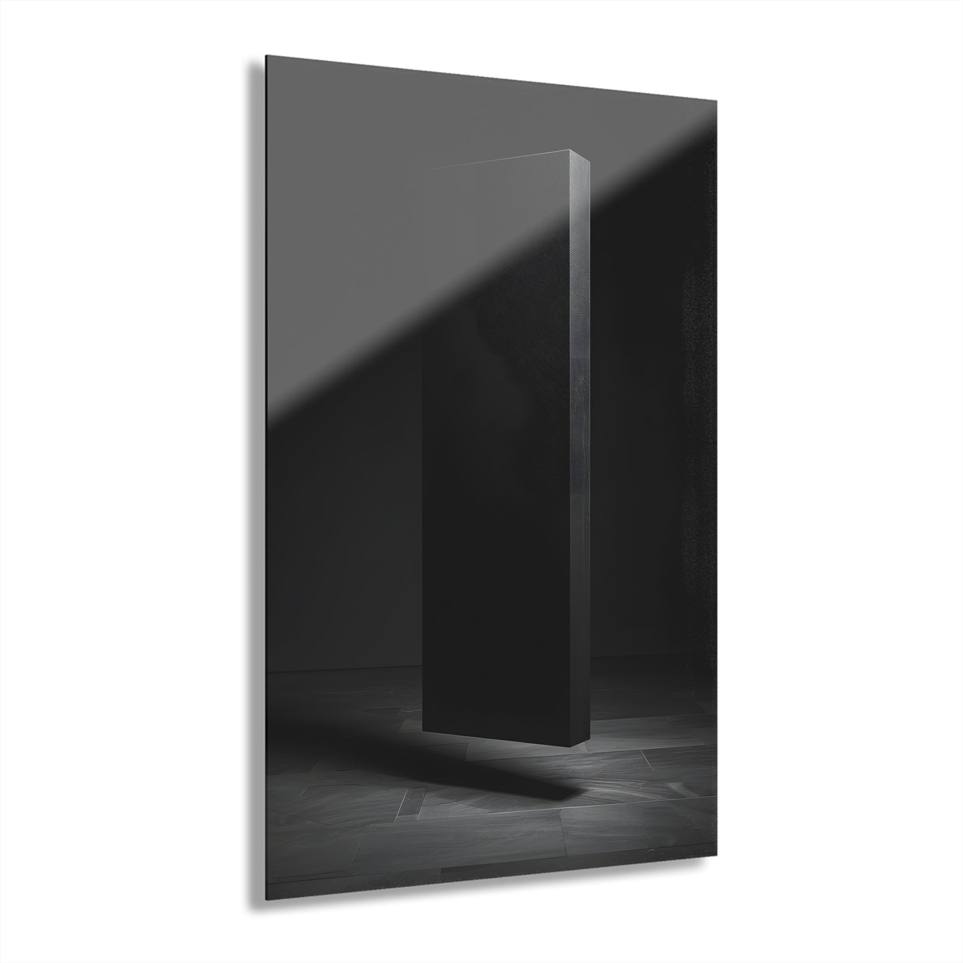 A single vertical monolith appears suspended in space, detached from the ground yet retaining a sense of weight and permanence.